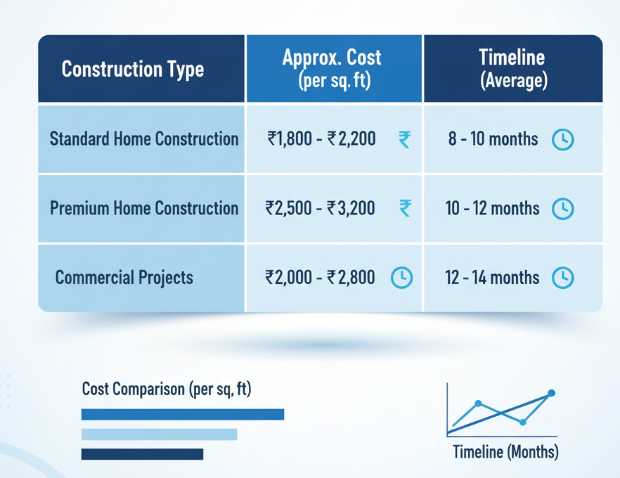 Costs typically range from ₹1,800 to ₹3,000 per sq. ft, depending on materials, finishes, and site conditions. AV Construction provides a detailed quote after site inspection and design finalization.